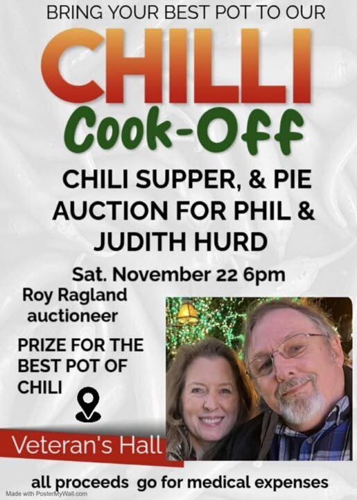 Benefit Chilli Cook-off and Pie Auction for Phil and Judith Hurd at the Veteran's Hall on 22 November at 6pm in Marshall. All proceeds go for medical expenses for Phil Hurd who has been out of work and under medical care for about 65 days. Please lend a hand!