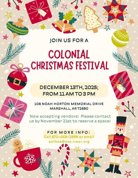 The Searcy County Senior Center is hosting the Colonial Christmas Festival at the Searcy County Veteran's Memorial Hall in Marshall and accepting vendors! 11am till 3pm on Saturday, 13 December.
