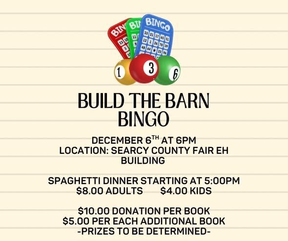 Build the Barn Bingo to raise funds for a new barn at the Searcy County Fairgrounds in Marshall! Begins at 6pm! Spaghetti dinner fundraiser at 5pm before the games begin!