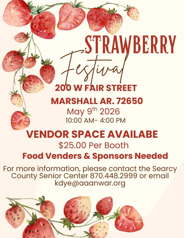 Strawberry Festival in Marshall at the Berry Shed! Games, Vendors, Crafts. Contact 870-448-2999 for more information.