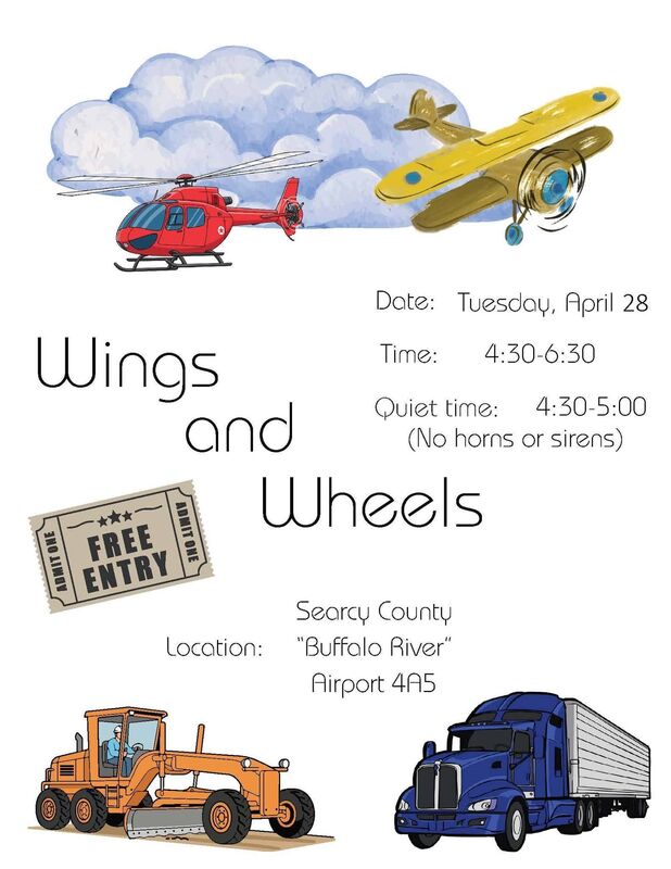 4th Annual Wings & Wheels event at the Searcy County Buffalo River Airport-4A5 in Marshall! Free! Bring the kids! Great, fun time! Quiet Time is from 4:30-5:00 (no horns or sirens). From 5:00-6:30, there will be vehicle noise allowed. For questions about the event or how to be a part of it, contact Melissa Smyth 870-448-6488.