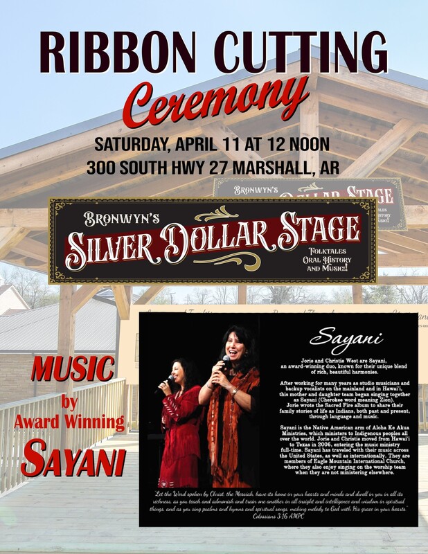 A ribbon-cutting ceremony for Bronwyn's Silver Dollar Stage will be held on Saturday, April 11, at noon at the future Heritage Park in Marshall. The park is located next to the Buffalo River Historic Jail & Museum. The day’s activities will include a special music program featuring Sayani, an award-winning mother-and-daughter Native American singing duo. Free! Please bring lawn chairs to enjoy this event!